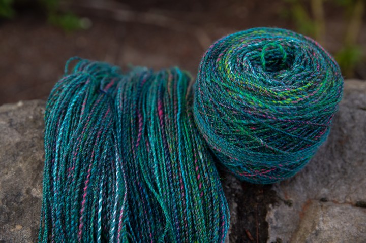 This single, or single-ply yarn has enough strength to be useful. But I’ll spin another single, and then twist them together, plying them, each twisting round the other, to form a two-ply yarn, which is even stronger, more balanced and complex.